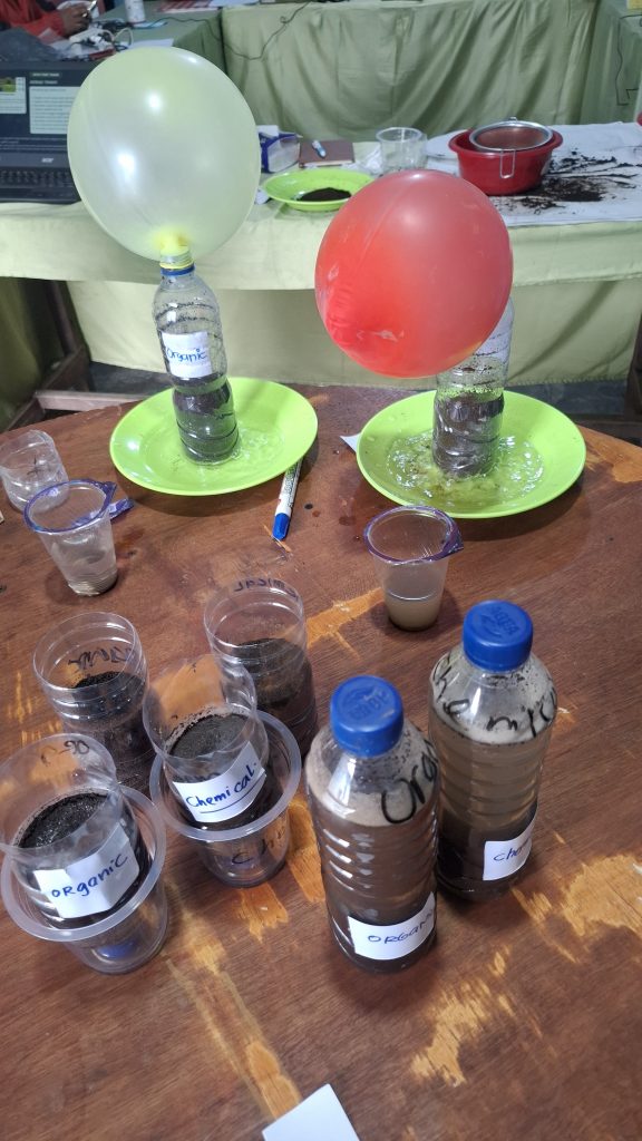 Dalam sesi pembelajaran ini, pengujian ekologi tanah dilakukan dengan metode yang sederhana dan mudah dipraktikkan. Berbagai alat yang digunakan berasal dari bahan yang mudah ditemukan di sekitar kita, seperti botol bekas, plastik, balon, dan bahan rumah tangga lainnya. Pendekatan ini menunjukkan bahwa mempelajari kesehatan tanah tidak selalu membutuhkan peralatan laboratorium yang mahal.